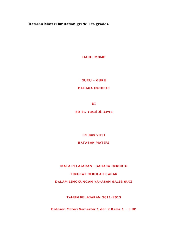 Batasan Materi Limitation Grade 1 To Grade 6 English Language